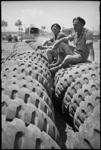 P T Hurren and G F McClure sit on large tyres close to forward areas of the Cassino Front, Italy, World War ...