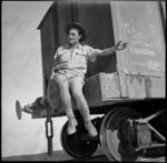 G Gregory, New Zealand Railway Operating Company, in an engine cab, Western Desert, World War II