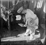 Member of the New Zealand Railway Operating Company firing a railway engine, Western Desert, World War II