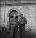Brigadier Weir and Brigadier Parkinson confer outside Brigade HQ on Sangro River Front, Italy, World War II ...
