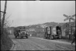 Vehicles of 2 NZ Divison near a railway crossing on road near Italian Front lines, World War II - Photograph...