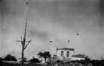 Scene in Galatos, Crete, showing 3 German paratroopers in the sky