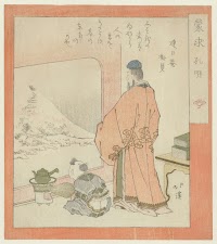 Courtesan and Kamuro Looking at the Face of a Komusō Reflected in a Mirror