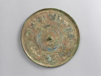 Bronze mirror depicting figures and horses in color