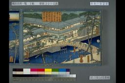 此所ハ本町一丁目ヨリ本町二丁目同うら通海岸町二丁目磯ニ至神奈川明神前ヨリ渡舟の上場等を見渡之風景ナリ・横浜本町三丁目ヨリ四丁目迄うら通海岸町三丁目四丁目共ニ見渡ス其磯ニ至りて波涛打を一覧之景色ナリ・西の方波戸場ヨリ真直の通リハ港崎町ゑもん坂ニ出るを見るナリ并海岸町御船蔵本町五丁目大通リ商家の有様を見渡すに至る・東波戸場ハ買取たる荷物を小船ニ積入本船にうつす之有様なり西波戸場ハ江戸ヨリ積おくるの荷物を水揚の所ニて此東ハ運上屋ヨリ下リたるをつミ入る場所ナリ・横浜本村ヨリ杉山薬師道并ニ本牧十二天道の辻横浜新田等を見渡す之景