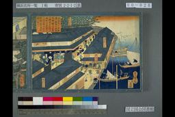 「海岸町一丁目船場ハ神奈川渕崎明神前ヨリ此所へ渡木戸の内ヨリ本町一丁目なりうしろに弁天山の松林迄を見込ノ図なり」