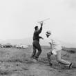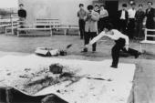Shimamoto Shozo making a painting by hurling glass bottles of paint against a canvas, 2nd Gutai Art Exhibition