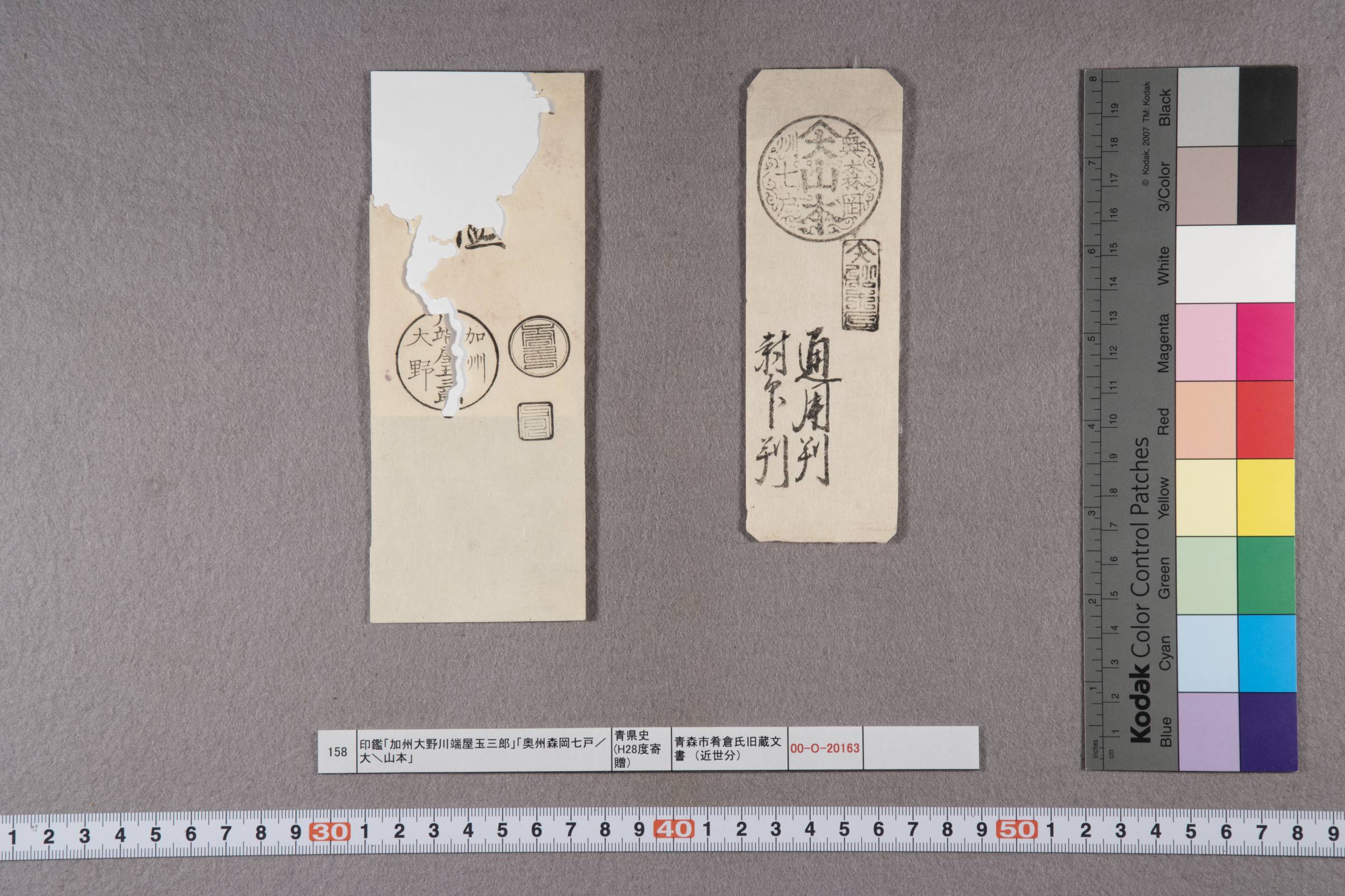 印鑑「加州大野川端屋玉三郎」「奥州森岡七戸/大\山本」