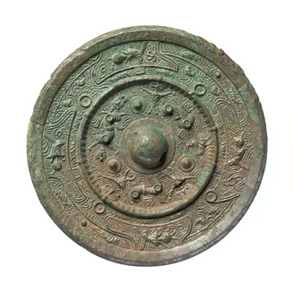 Mirror with Triangular Rim, Design of Three Divinities and Three Animals