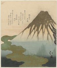 Gezicht op de oever van een rivier te Japan, met op de achtergrond de berg Fuji