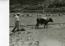 牛に鋤を付けて田を耕す