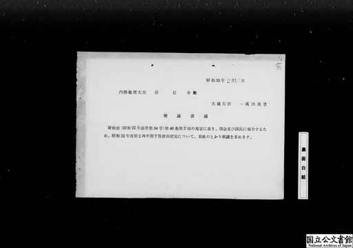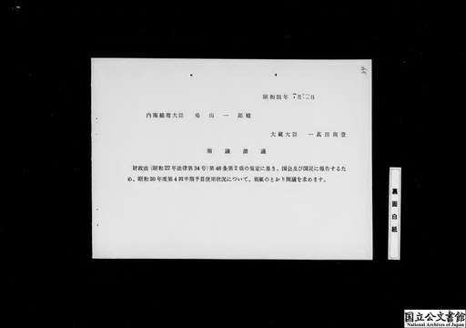 財政法第46条第2項の規定に基き昭和30年度第4・4半期中における予算使用の状況を国会及び国民に報告することについて(大蔵省)