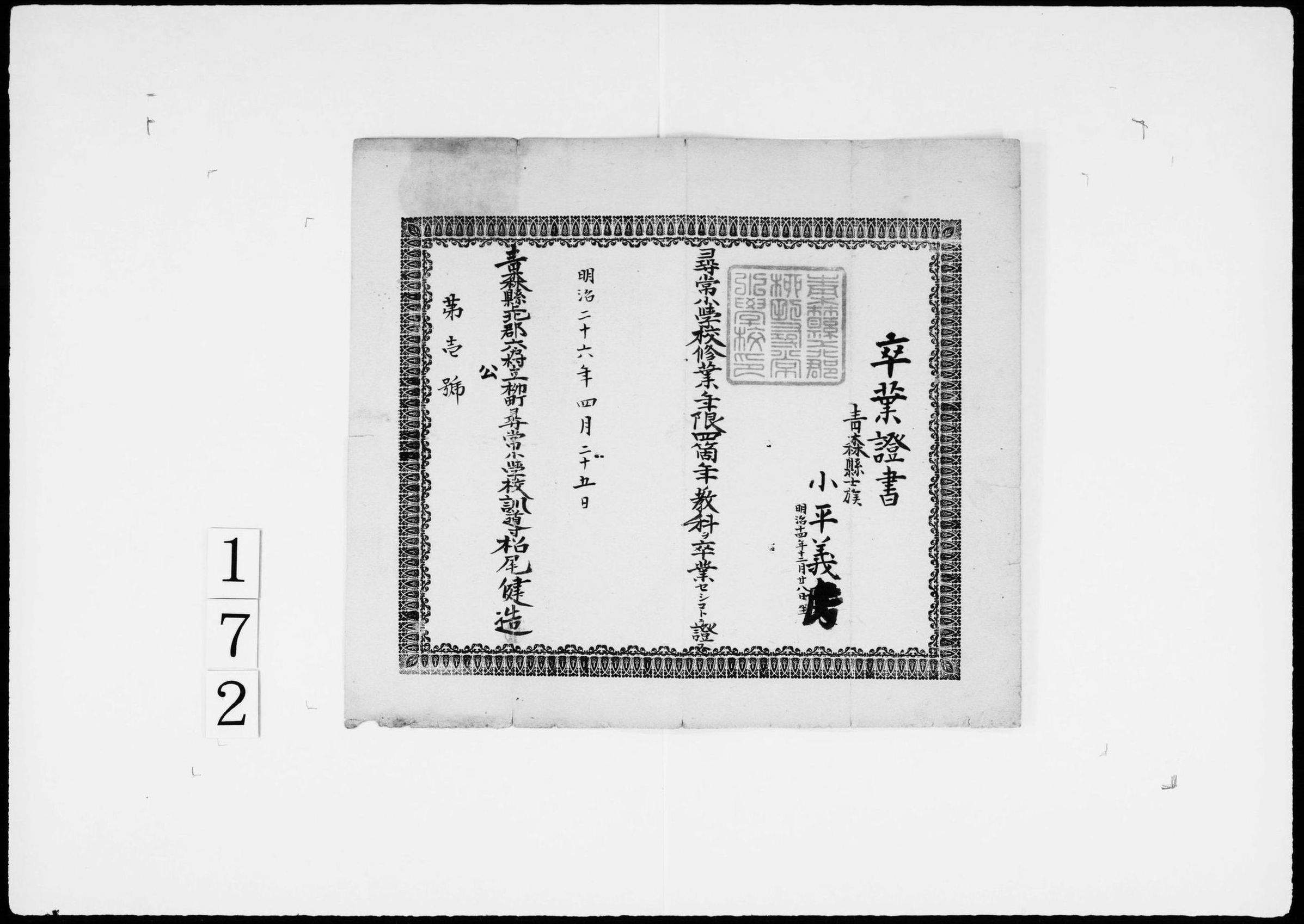 卒業証書(尋常小学校四箇年)