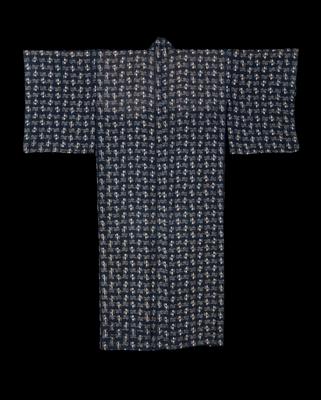 Dark-blue ground kimono with white ikat (kasuri) pattern made in Shiga Prefecture