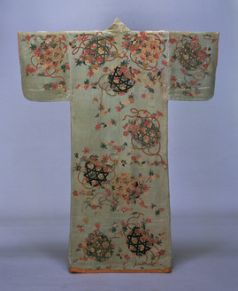 Kimono (Kosode) with Wickerwork Baskets Filled with Flowers and Autumn Leaves