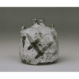 Hanging Vase with Lugs and Cypress Fence in Underglaze Iron Brown and Shino Glaze (Seto Ware)