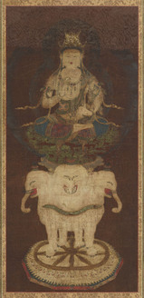 Shaka Nyorai (Shakyamuni Buddha) with the Bodhisattvas Monju Bosatsu (Mañjusrî) and Fugen Bosatsu (Samantabhadra); Shakyamuni Triad (Shaka sanzon zō)