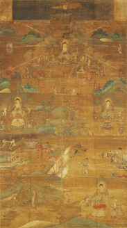 Welcoming Descent of Amitâbha Buddha (Amida Nyorai) flanked by the Bodhisattvas Avalokiteshvara (Kannon Bosatsu) and Mahâsthâmaprâpta (Seishi Bosatsu); Amida sanzon raigō zu