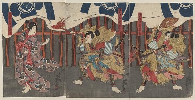 Mimasu Jakusaburō I as Komawakamaru, Nakamura Utaemon IV as Matsuemon, and Kataoka Ichizō I as Gonshirō
