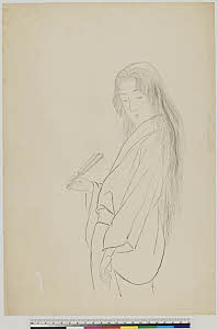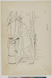 A Japanese woman holding a fan. Watercolour, 18--