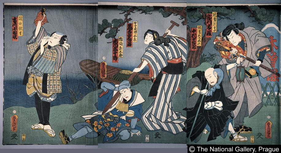 Segawa Kikunojo as Jitsuemon nyobo Nagisa, Bando Mitsugoro as Kabu Tomohei, Iwai Hanshiro as Kimagure Osaka (Object)