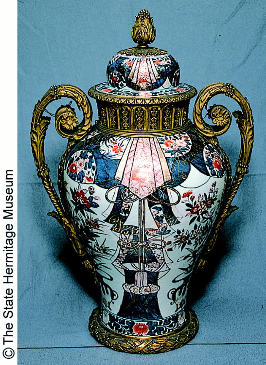 Covered jar with metal fixures and design of floral arrangements