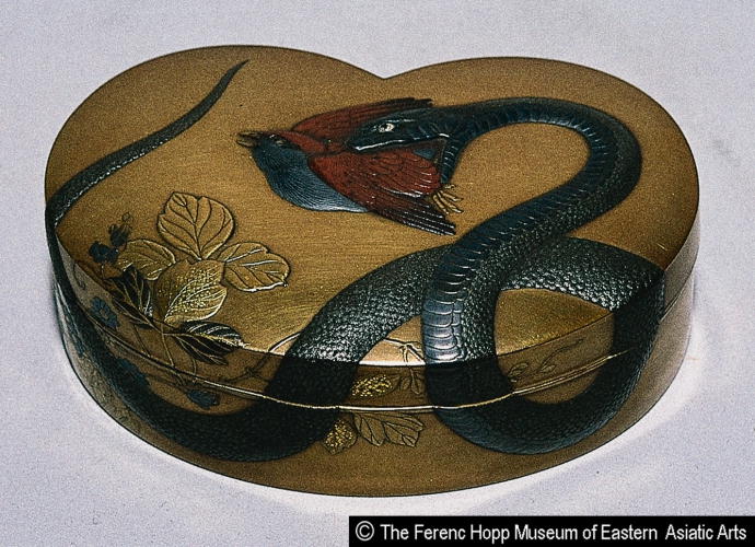 Fan-shaped incense box with design of snake catching a bird