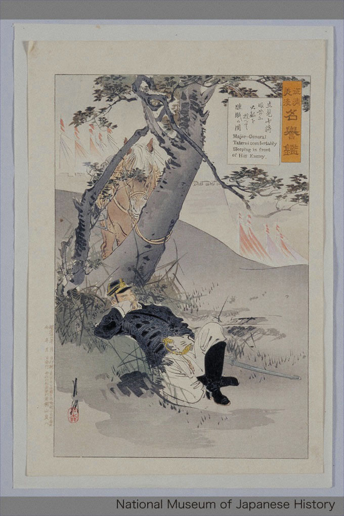 「征清美淡名誉鑑」 「立見少将眼前に大敵を控へて睡眠の図」