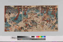 「和漢名将組上の内」 「漢」「三国志の図 三枚つゞき」「諸葛孔明 市川団十郎」「劉備元徳 尾上菊五郎」「関羽 市川左団次」「張飛 市川権十郎」「唐子 ●●●」