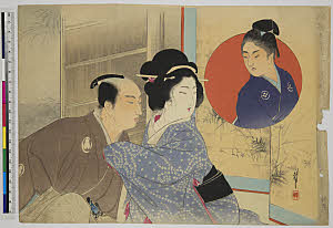 Courtisan Sitting Next to Rustic Genji, central sheet of the triptych Moon, from the triptych series Snow, Moon, and Flowers of the Eastern Genji