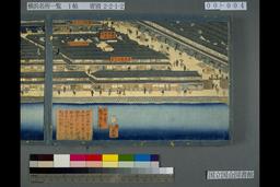 此所ハ本町一丁目ヨリ本町二丁目同うら通海岸町二丁目磯ニ至神奈川明神前ヨリ渡舟の上場等を見渡之風景ナリ・横浜本町三丁目ヨリ四丁目迄うら通海岸町三丁目四丁目共ニ見渡ス其磯ニ至りて波涛打を一覧之景色ナリ・西の方波戸場ヨリ真直の通リハ港崎町ゑもん坂ニ出るを見るナリ并海岸町御船蔵本町五丁目大通リ商家の有様を見渡すに至る・東波戸場ハ買取たる荷物を小船ニ積入本船にうつす之有様なり西波戸場ハ江戸ヨリ積おくるの荷物を水揚の所ニて此東ハ運上屋ヨリ下リたるをつミ入る場所ナリ・横浜本村ヨリ杉山薬師道并ニ本牧十二天道の辻横浜新田等を見渡す之景