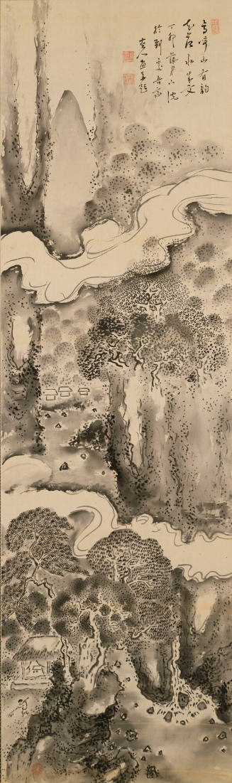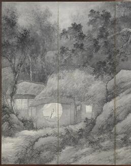 Tea bowl with design of mountain retreat