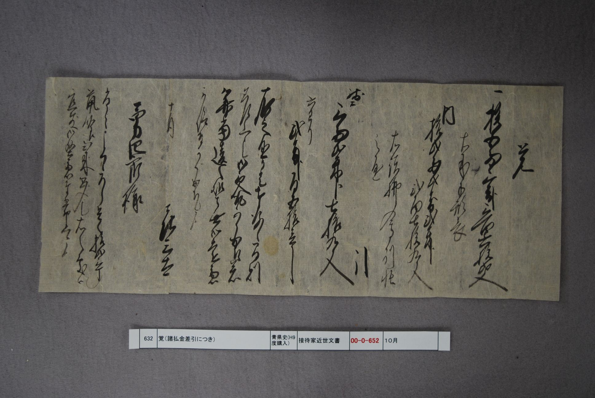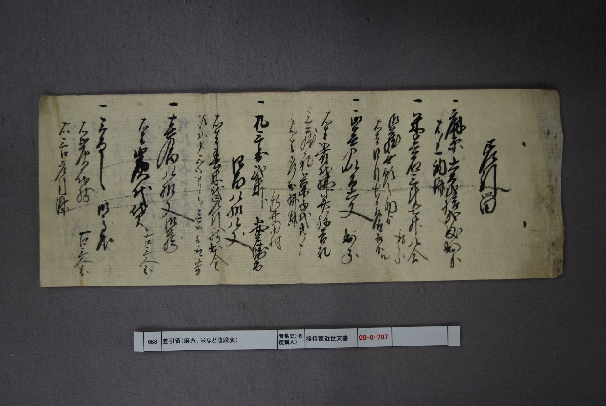 差引留(麻糸、米等の金銭出入帳断片)