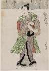 Woman holding puppet of actor Onoe Kikugoro III as Gokuin Sen'emon