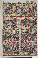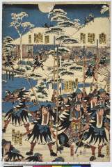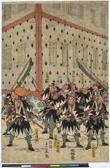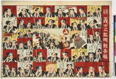 「誠忠之義士遂本望図」 「吉田定右衛門」「前原江助」「矢田五右衛門」「初田新右衛門」「三浦次郎右衛門」「原郷右衛門」「吉田周左衛門」「貝田弥左衛門」「大高伝吾」「矢頭与茂七」「浦松喜兵衛」「若野金右衛門」「斧寺幸右衛門」「近松半六」「横川半平」「岡島安右衛門」「片岡伝五右衛門」「富守祐右衛門」「間勢忠太夫」「大星力弥」「千崎弥五郎」「織部弥兵衛」「寺岡平右衛門」