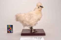 Een opgezet exemplaar van Gallus sp. (Kip/Japans hoen) staand op een stuk kurk