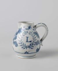 Ewer with the letter 'L' in a laurel wreath among flowering plants