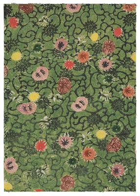 Green-ground fragment decorated with floral arabesques and hollyhocks