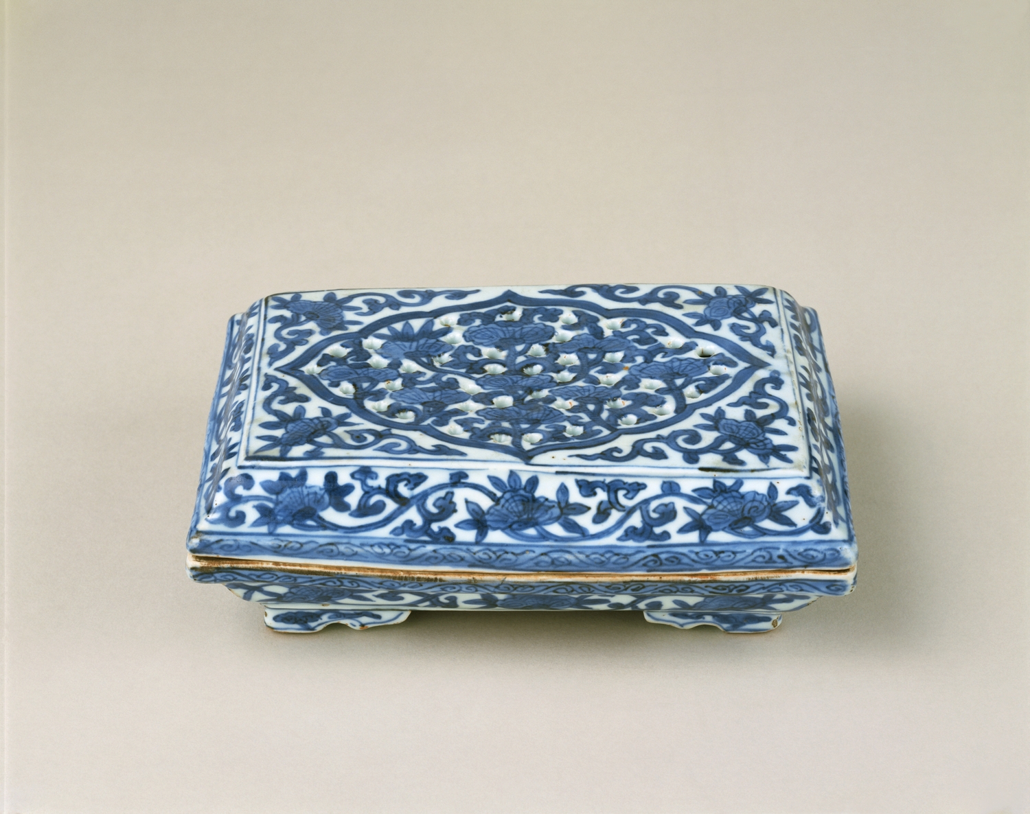 Covered Rectangular Open Work Box with Design of Scrolling Plant in Underglaze Blue