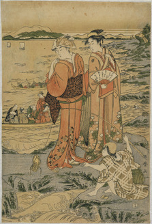 Lady with maid and child at Enoshima, one sheet from a triptych