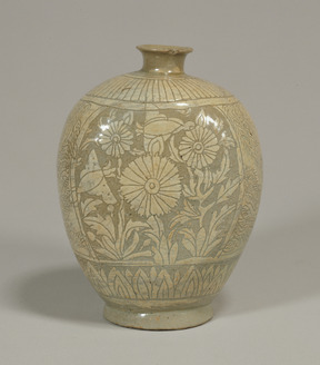 Flask Flowering plants and butterflies carved through white slip