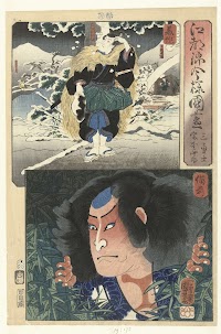 Nakamura Utaemon III as Kasahara Rōō (right panel), and Nakamura Shikan II as Miyamoto Musashi (left panel)