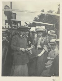 Gezicht op het meer van Hakone met op de voorgrond kinderen met een draagkoets