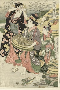 Gezicht op de vismarkt op het strand te Shiba