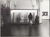 Zaal met twee bezoekers voor een Japans kamerscherm