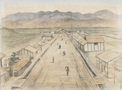 東北新道石版画 栃木県那須郡三島村肇耕社事務所門前の図