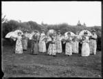 [Two old men, possibly actors, one standing, holding an umbrella, the other reclining]