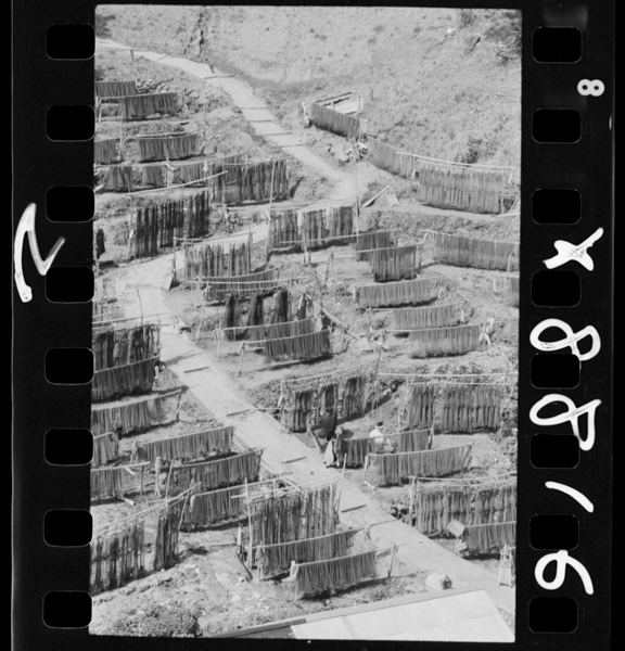 Drying shrimp fishing nets on the shore of Lake Kamo in Ryotsu where sea water enters freshwater lake. It is also a place for oyster farming
