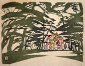Aoi Festival Procession Passing the Bank of Kamo River, stencil dyeing on paper