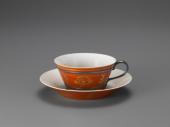 Cup and saucer, plum design, gold on overglaze red enamels